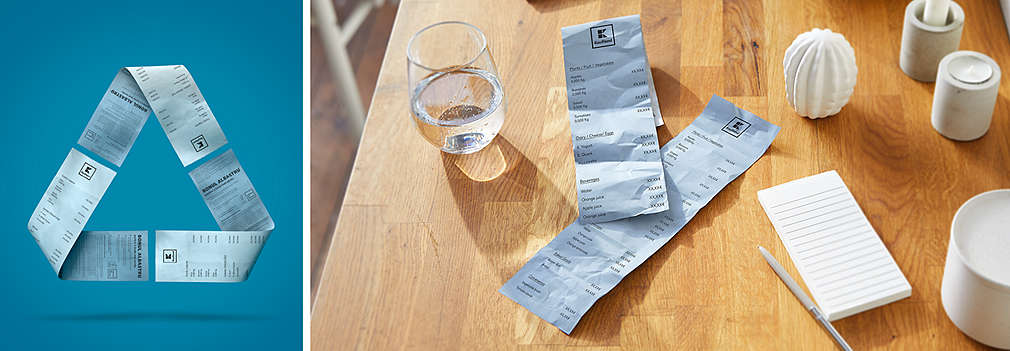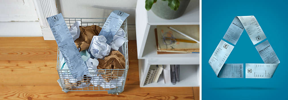 În timp ce bonurile produse din hârtie obișnuită sunt considerate deșeuri reziduale, bonul nostru ecologic poate fi reciclat în siguranță alături de hârtie și carton. În plus, nu utilizăm folii de PVC pentru ambalarea rolelor pentru casa de marcat, evitând astfel folosirea a peste 30 de tone de plastic la nivelul Grupului Schwarz.